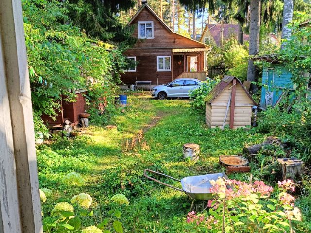 **Продается уютная дача с зимним и летним домом, баней и участком 5,4 сотки в живописном месте, в ухоженном садоводстве, всего 35 минут от СПб!** **Об объекте:** На участке 5,4 сотки расположены: * Теплый зимний дом из бруса (утеплен, 2 этажа, готов к проживанию) * Летний дом с кухней и верандой. На втором этаже гостевая спальня, гардеробная, 2 кладовки. * Финская баня с душевой и комнатой отдыха * Парковка до 6 машин, хозблок, летний туалет. * Зоны отдыха, плодовые деревья, кустарники, сирень, хвойные и лиственные деревья. Характеристики: **Зимний дом:** * 1 этаж: спальня, гостиная с камином, кухня с гарнитуром, электроплитка, обеденная зона * 2 этаж: большая спальня с балконом, зона отдыха, гардеробная и кладовые. Мебель встроенная, по индивидуальному заказу, массив сосны. * Отопление: камин первого этажа. * Двойные утепленные двери и деревянные окна **Летний дом:** * Комната 18 м², кухня, летний водопровод, бойлер, газовая плита * Новые полы, покрытие линолеум **Участок:** * Ровный, сухой, дренажная система * Ухоженная территория, зонирование, посадки Просторная парковка. ** Водоснабжение: Летний водопровод действует с апреля по октябрь. Возможно подведение канализации в дом. биотуалет. **Транспортная доступность:** * 15 мин пешком до ж/д станции Грузино или 47 км * 35-40 мин от м. Просвещения на автобусе * Удобный заезд с Новоприозерского шоссе **Инфраструктура рядом:** * Магазин в 50 м, рядом Магнит, Вимос, кафе * Фермерские продукты, хлеб, молочка * Скважины с артезианской водой **Дополнительно:** СНТ модернизировано в 2024 году (увеличена мощность электроснабжения) освещение улиц, шлагбаум * Подъезд круглый год, дороги чистят. * Прямая продажа, подходит под ипотеку **Цена включает всю мебель и технику!** Звоните! Просмотр по договоренности. дополнительные видео по запросу! Полный пакет документов.