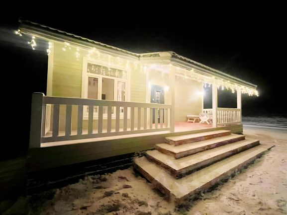 - 1 этаж — жилой: 3 мебелированные комнаты, кухня, летняя терраса с обеденным столом и сервантом, небольшое открытое крыльцо под навесом.