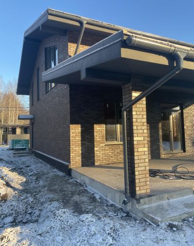 ДОм 108 кв.м., 2-этажный, комбинированный-брусовой низ, каркасный верх, с утеплением и деревянной обшивкой, на сваях, крыша металлочерепица. Есть нюансы в наружной отделке: не закончена обшивка фундамента и 2х стен с дворовой стороны. В остальном, очень интересный проект, не обычный с большой высокой террасой. Хорошее решение загородной жизни в мокрые дни - есть где комфортно провести время на свежем воздухе.