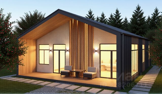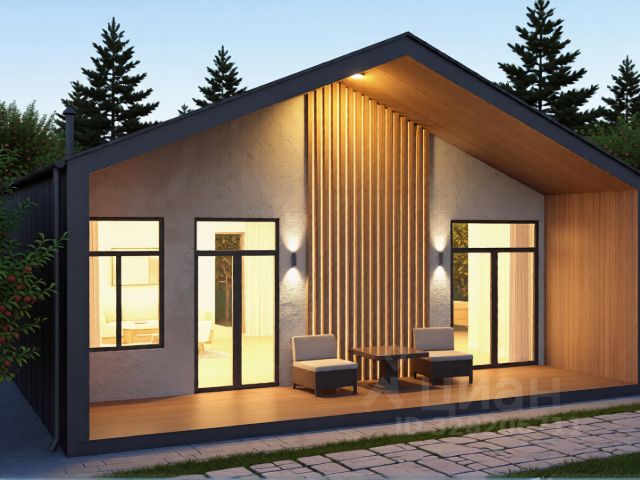 1 эт. — прихожая, сан/узел, кухня-гостиная с камином, сауна, кабинет, терраса, гараж с хозблоком.