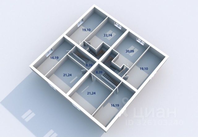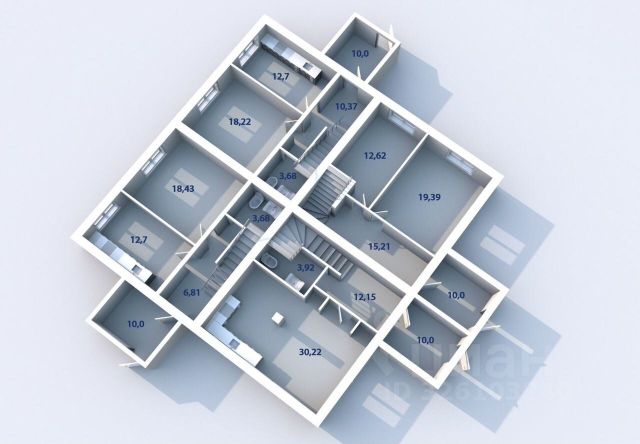 2 этаж: (высота потолка 3,2 м): гостиная 46,4 м2, санузел с сауной 13,1 м2, гостиная 32,6 м2, холл 24,1 м2, спальня 19,4 и 25,5 м2, ванная 15,6 м2; 3 этаж: холл 154,8 м2 (общая 185,1 м2).