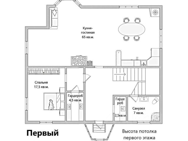 Высота потолков: 3 метра на первом этаже и 2,8 метра на втором этаже.