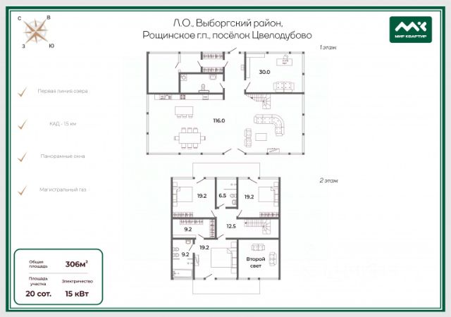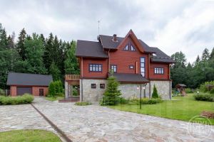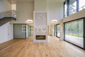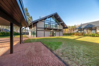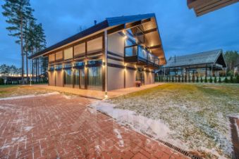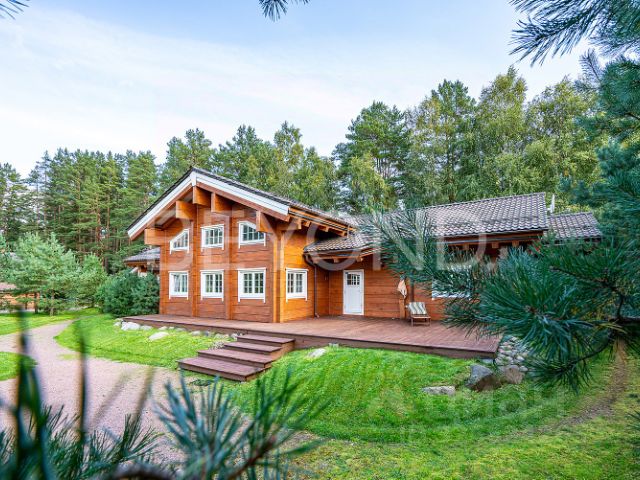 На берегу живописного Нахимовского озера расположился замечательный жилой дом, который воплощает в себе гармонию природы и эксклюзивного дизайна. Это уникальный проект, общая площадь которого 1000 кв. м, разработан с учетом потребностей большой семьи, предлагает просторные помещения и несравненную атмосферу уюта. Фасад дома выполнен в современном стиле с использованием облицовочного кирпича, лиственницы и медных панелей с фальцем, который гармонично вписался в окружающий ландшафт. Огромные панорамные окна наполняют комнаты светом и предоставляют захватывающий вид на гладь озера, что создает ощущение единства с природой. Интерьеры оформлены в нейтральных тонах, подчеркнуты натуральными материалами, такими как дерево и камень, и дарят ощущение тепла и комфорта. Дом условно поделен на две независимые части, объединенные на первом этаже спа-зоной с бассейном, а на втором этаже -эксплуатируемой крышей. На первом этаже в одной части дома располагается кухня-гостиная с камином и выходом на террасу, раздевалка, хаммам и сауна с выходом в бассейн. В другой части дома находится кухня-гостиная и малая зона отдыха. Второй этаж отведен под уютные мастер-спальни, каждая из которых имеет свой индивидуальный стиль. Есть верхняя гостиная с оборудованной кухней, из которой можно попасть на эксплуатируемую крышу- идеальное место для отдыха в кругу семьи и друзей. На мансардном этаже располагается еще одна мастер-спальня с выходом на балкон, с которого открывается обворожительный вид. Особое внимание уделено благоустройству прилегающей территории: ближе к озеру построена баня с уютной террасой, есть гостевой дом и гараж на два машино-места с комнатой для охраны. Прекрасная природа Карельского перешейка: рыбалка, грибы и чистый воздух отличное место для отдыха и жизни. До центра города можно добраться по трассе "Скандинавия" за один час. Купить большой коттедж в городском поселении Рощинское Выборгского района.