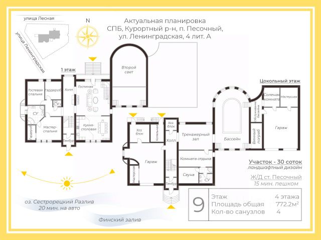 Арт. 120878668 Загородная резиденция с бассейном и банным комплексом — это уникальный коттедж из двух корпусов общей площадью 610 м², расположенный всего в 5 км от КАД по Выборгскому шоссе. Всего в резиденции 15 отдельных спален с собственными санузлами и душевыми, Wi-Fi, две открытые террасы — идеальные условия для большой семьи или приёма гостей. Первое здание включает цокольный этаж с современной кухней, оборудованной газовой плитой, вытяжкой, микроволновой печью и холодильником. На первом этаже расположены большой банкетный зал, бар с барной стойкой и общий санузел. На втором и третьем этаже — 7 комнат отдыха с собственными душевыми и санузлами, двуспальными и односпальными кроватями, а также двумя двухспальными диванами. Второе здание — полноценный банный комплекс премиум-класса. Первый этаж включает большую русскую баню из канадского кедра с потолком из можжевельника и стеной из морской соли. Большой тёплый глубокий бассейн наполнен термальной минеральной солёной водой и оснащён аттракционами: противоток, гейзер, гидромассаж, водопад. Установлена профессиональная система очистки воды. Большая зона отдыха около бассейна оборудована столиками и барной стойкой. Также на первом этаже расположены раздевалка, две душевые и общий санузел. На втором этаже находятся 8 комнат отдыха с собственными душевыми и санузлами, оборудованными двуспальными и односпальными кроватями. На участке есть зона барбекю с мягкой мебелью, мангалом и местом для приготовления плова. Парковка рассчитана на 10 автомобилей. Территория благоустроена с декоративной подсветкой. Техническое оснащение включает магистральный газ и две скважины — по одной на каждый дом. Резиденция расположена на закрытой охраняемой территории в посёлке Дибуны (Песочный). Предусмотрены два въезда на участок. Дорога к участку регулярно обслуживается муниципальными службами, обеспечивая комфортный проезд круглый год. До озера с благоустроенным пляжем и детской площадкой всего 100 м. Рядом находятся продуктовый магазин, конный клуб, школа-сад, строительный магазин, бары и рестораны. Звоните, чтобы узнать детали и договориться о просмотре! Большой коттедж с красивой территорией в поселке Песочный в Санкт-Петербурге.
