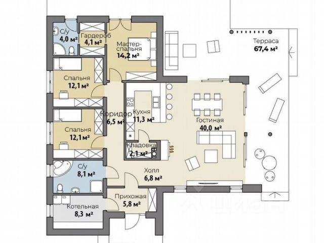 Просторная кухня-гостиная с выходом на террасу, гостевая комната,