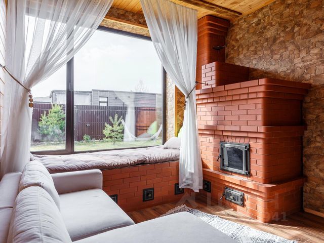 Русская печка с лежанкой вдоль панорамного окна, которая является сердцем дома. Топка печи выполнена из шамотного огнеупора, сама печь из высококачественного импортного кирпича Lode, по индивидуальному проекту.