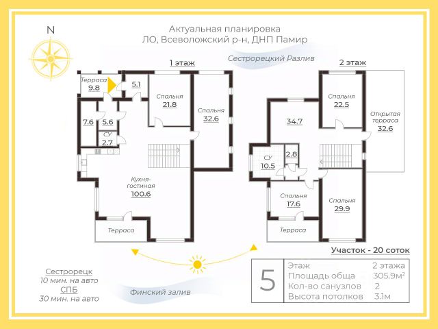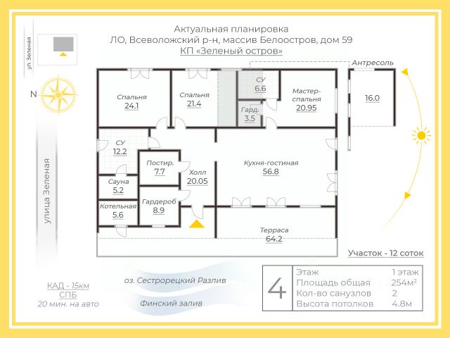 Продаем чудесный загородный дом среди многолетних сосен и звезд! Плoщадь участка - 11 сoток. Oбщaя плoщaдь дома - 134.7 кв.м (с террасами). Кухня-гостинaя 36 кв.м, две спальни (13 кв.м и 10 кв.м), кабинет-библиотека 13 кв.м и просторная ванная комната с окном. Дом имеет статус жилого, возможна прописка. ДубльДом (модель Kashtan) с дополнительными террасами и широкими лестницами с торцов. Дом полностью оснащен всей мебелью (divan ru, ikea, sk design) и бытовой техникой (Liebherr, Bosch, Indesit). В каждой комнате установлены умные электрические конвекторы, которые автоматически обогревают дом круглый год на ту температуру, которую вы на них установите. Зимой в доме не холодно, даже у окон. Дополнительно в гостиной установлена стильная и мощная печь. Площадь участка 11 соток. На территории сохранены многолетние сосны и естественный лесной покров, растет вереск и черника. По всему периметру участка на соснах висят звезды Herrnhuter (Германия), такие же украшают территорию Новой Голландии и Севкабеля. Все кабели уложены под землей, поэтому звёзды светят для вас в любое время года. Также под самыми крупными соснами установлена нижняя подсветка с земли. Участок огорожен забором с калиткой и автоматическими откатными воротами. По периметру забора встроенные светильники (Италия). На территории участка есть парковка на 2-3 машины и хозблок площадью 12 кв. м, выполненный в стилистике дома. Установлен резервный автоматический генератор на 8 кВт. На территории СНТ есть детская и спортивная площадки, футбольное поле с трибунами, зимой устанавливают ёлку, дети катаются с горки. В двух минутах чистый сосновый лес, где водятся ежи, лисы, зайцы, иногда приходят лоси. В 20 минутах пешком (5 мин на машине) озеро (карьер) с чистой родниковой водой и песчаным пляжем. СНТ охраняется (2 пункта КПП), въезд только по пропускам. Крайне удобное расположение: до ЗСД всего 7 минут на авто, а до ст.м. Беговая можно доехать за 30-40 минут. Звоните, с удовольствием отвечу на все ваши вопросы и оперативно организую показ! Продам элитный дом в городском поселении Сертоловское Всеволожского района.