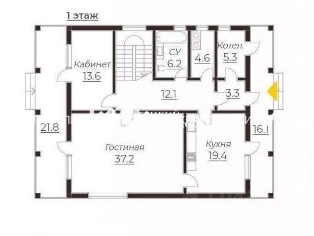 Большую часть 1 этажа занимает кухня-гостиная с панорамными окнами на три стороны света, с выходом на крытый балкон и открытую террасу. Здесь также находятся кабинет, гостевой санузел и хозяйственная кладовая/прачечная с входом прямо из кухни.