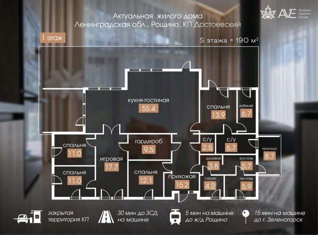 Лот Z1342 Продается современное домовладение площадью 185 кв.м. на 15 сотках в окружении сосен в Рощино, что позволяет с учетом новой трассы Скандинавии добираться до центра за 45 минут. Дом построен из клееного бруса 165х165 мм в один этаж и имеет 3 спальни, 2 сан.узла, просторную кухню- гостиную с камином и панорамными окнами. Для отделки использовались дорогие материалы: на полах паркетная доска и керамогранит. Установлен кассетный камин. Вдоль всего дома проходит терраса из лиственницы. Коммуникации в коттеджном поселке: центральное газоснабжение, центральное водоснабжение, электричество 15кВт. Локальная канализация установлена на участке. Отопление дома от газового котла. Коттеджный поселок "ЦК-2" расположен в современной части Рощино напротив курорта Царство Королевство с популярным спа и рестораном, это позволяет пользоваться сервисом на постоянной основе, а еще и таким бытовым моментам как клининг и доставка еды из ресторана или универсама Репинский, который находится в непосредственной близости в курортном районе. Рощино- очень современная локация, где есть красивые сосновые леса, много озер, Финский залив, с его прогулками недалеко, удобная трасса через "Скандинавию" и ЗСД быстро добираться до города. Рядом вся инфраструктура Курортного района включая: спортивный комплекс, SPA отели, рестораны, школы, детские сады. Поэтому здесь все создано для удобства постоянной жизни за городом. Звоните! Организуем просмотр! С 2011 года формируем рынок элитной загородной недвижимости — знаем каждый поселок лично, гарантируем юридическую чистоту сделок. Экспертиза наших агентов на уровне застройщика. 30% наших объектов не попадают в открытые каталоги — запишитесь на конфиденциальные просмотры. Продам элитный дом в поселке городского типа Рощино Выборгского района.