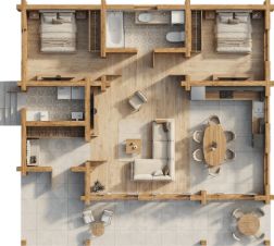 Для увеличения уровня комфорта дом разделен на три функциональных юнита: спальный, жилой и хозяйственный (технический). В технической (хозяйственной) части сосредоточено все для благополучного функционирования дома: гараж, котельная, кладовая, помещение для персонала и т.д. Жилая часть представляет собой простор и комфорт: кухня-столовая площадью 40 м², гостиная 53 м², кабинет (гостевая комната), а также спа-зона. Спальная часть включает три просторных спальни с гардеробными, гостевая спальня и великолепный вид из окон на сад и сосновый лес.