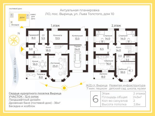 ДОМ 86 кв.м. 8,5 сот. ИЖС Вырица, Ленинградская область Продаётся земельный участок ИЖС с домом, в исторической части поселка Вырица, Гатчинский район, Ленинградская область, на ул Газа. Участок общей площадью 8.44 сотки, прямоугольный, ровный, огорожен со всех сторон, есть въезд и место для парковки нескольких ам. Границы определены. Участок разработан (газон, декоративные растения без плодовых деревьев), оборудован беседкой и спортивной/игровой площадкой. Дом уютный двухэтажный, для сезонного проживания, щитовой , построен в 2006 году размер дома 8 8 м с верандой. Фундамент столбчатый из бетона. Окна ПВХ, косметический ремонт. Площадь первого этажа 60 кв. м (кухня, гостиная, 2 спальни, с\у, веранда), площадь мансардного этажа 26 кв.м (2 спальни). Назначение гостевой дом,без прописки, есть возможность постройки основного дома на этом же участке. Коммуникации: водоснабжение — собственная скважина, канализация септик (кольца), электричество 15 кВт. Отопление электричество. Газ по границе участка. Участок расположен на 2-й линии левого берега реки Оредеж, расстояние до берега 5-10 минут пешком. Прекрасная возможность для отдыха на реке (рыбалка, прогулки на САПе и т.д.) В шаговой доступности исторические и природные памятники: древние курганы (11-12 в), вырицкий дуб, Титово поле, знаменитый Васильевский дворец. До Храма Казанской иконы Божией Матери путь составит около 20 минут пешком. Лес с грибными и ягодными местами также в шаговой доступности, около 15 минут пешком. В поселке прекрасно развита инфраструктура: большой выбор магазинов (том числе сетевых), аптек, есть пекарни, рынок, поликлиника, больница, ФОК с бассейном (Газпром). Расстояние до остановки общественного транспорта 5-7 минут пешком (маршруты Вырица, Гатчина, Сиверский). Расположение дома позволит насладится всеми возможностями дачной жизни не отказываясь от комфорта и благ цивилизации. Растояние до СПБ 70 км, путь до электрички 10-15 минут на автобусе до ст. Вырица, около 25-30 минут пешком до станции 2 платформа. Прямая продажа, без обременений, один собственник. Документы готовы к сделке. Ожидаем Вас на просмотр, звоните!