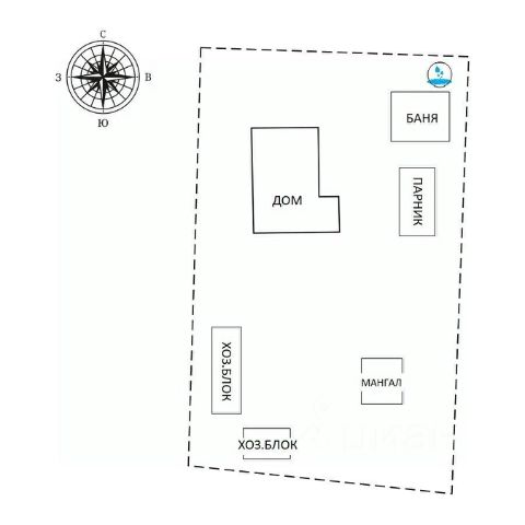 Жилой дом, мастерская, баня, дровник, детская площадка.