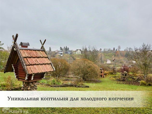 На территории есть печь для натурального холодного копчения. Беседка из бревна. Бассейн с фонтаном, и много элементов декора.