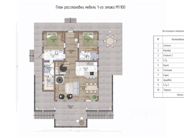 На первом этаже дома расположены: кухнястоловая, гостиная с камином и вторым светом, гостевая комната, санузел с душевой, сауна, постирочная, погреб. На втором этаже расположены три спальни и ванная.