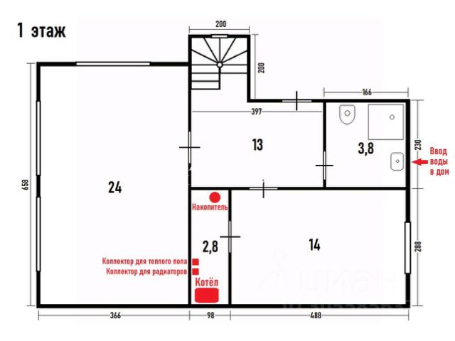 Водоснабжение: Скважина, которая наполняет колодец, далее через систему фильтров в водопровод. Бойлер горячей воды на 100л;