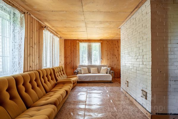 Просторная кухня-гостиная (22,1 м кв) с высокими панорамными окнами в пол, установлен камин (чугунная печь "Гучалава" - производство Сербия), три спальни, санузел, прихожая и техническая комната.