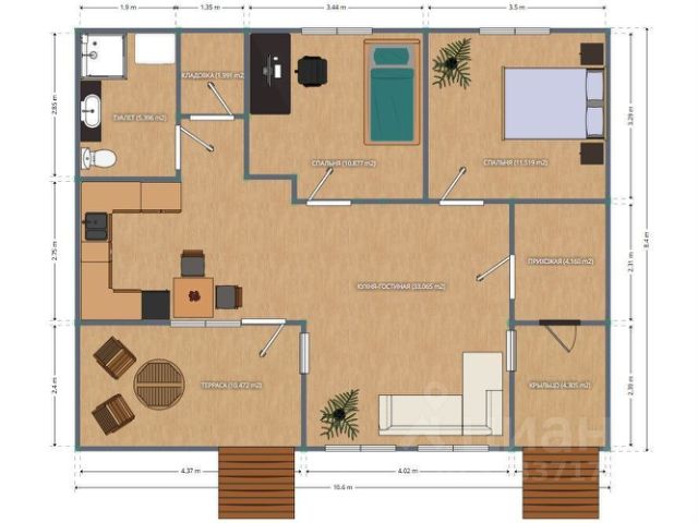 Высота потолка в гостиной 4 метра, в остальных помещениях 2,7 метра.