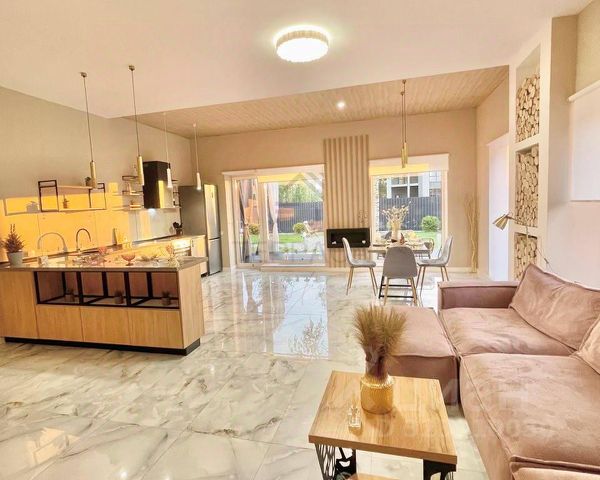 Премиум-дом с мебелью, техникой и террасой — 15 км от КАД! НЕ АГЕНТСТВО! Готовый новый дизайнерский дом 187.9 м² в охраняемом коттеджном посёлке Синицыно с полной отделкой, мебелью, техникой, посудой, текстилем — можно заехать сразу, хоть сегодня! Главное коротко: * Площадь: 187.9 м² * Участок: 8.9 соток * Этажность: 1 этаж * Потолки: 3.2 метра * Комнат: 3 спальни + кухня-гостиная 43,7 м² * Санузлов: 3 (гостевой, общий с сауной и душевой и мастер-санузел: с отдельностоящей ванной и душевой) * Постирочная комната с раковиной и стиральной машиной * Гардеробные комнаты: 2 (на входе и в мастер-спальне) * Юридически: собственность, прописка возможна * Цена: 34 990 000 млн ₽ Скидка и подарок при полной оплате! Технологии: * Фундамент: монолитная плита * Стены: газоблок D400, 375 мм * Кровля: плоская монолитная плита, утепление, гидроизоляция технониколь, разуклонка, греющий кабель с автоматическим управлением * Окна: панорамные энергосберегающие стеклопакеты с чёрной фурнитурой * Фасад: декоративная штукатурка + декоративные панели, подсветка с умным управлением Инженерия : * Отопление: тёплые полы с антифризом и климат-контролем по комнатам. В каждом помещении установлены терморегуляторы, работают от Алисы, с телефона и вручную *Газ!!! Установлен газовый котел. * Вентиляционная установка: приточно-вытяжная !установка! с рекуперацией, увлажнением и охлаждением воздуха, с автоматическим управлением * Вода: скважина + многоуровневая фильтрация + отдельная питьевая система * Канализация: станция биоочистки (не септик) * Электричество: 10 кВт. * Интернет: оптоволокно, розетки и Wi-Fi в каждой комнате Интерьер и комплектация: * Мебель: встроенная и дизайнерская, шторы, текстиль, светильники * Кухня: заказная, с техникой (холодильник, посудомойка, духовка, микроволновка, варочная панель, вытяжка, чайник, кофемашина) * Санузлы: 3 (один с душевой и ванной, второй с душевой и сауной, один гостевой на входе), плитка, сантехника премиум * Гостиная: ТВ Станция с Алисой 75 дюймов, с экраном и голосовым управлением * Спальня: мастер-гардеробная с туалетным столиком и зеркалом * Постирочная: встроенная машинка, раковина * Полы: влагостойкий кварцвинил, керамогранит в прихожей, котельной и санузлах * Потолки: натяжные, встроенное освещение Участок и ландшафт: * Дренаж, выравнивание, газон, дорожки с подсветкой * Посадки: туи, сосны * Забор металлический штакетник на сваях с автоматическими воротами * Парковка - навес на 2 машины О посёлке: * 15 км от КАД (Мурманское шоссе) * КП "Синицыно": охрана, шлагбаум, тишина, лес * Магазин, детский клуб, Озон/WB/Яндекс-маркет, парк, конный клуб, детская площадка * Бесплатная доставка из Ленты, Перекрёстка, О'Кей и др. * Коммуналка: всего 2500 ₽/мес Бонусы: * Подарки при 100% оплате * Скидка обсуждается при быстром решении * Гарантия от застройщика * Возможна ипотека * Есть ещё дома на финальной стадии отделки можем показать все варианты Звоните / пишите — просмотр в любое время!