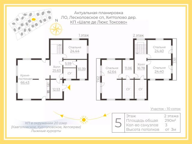 В приватной части Токсово, выставлен в продажу новый коттедж общей площадью 325,7 кв м на земельном участке 9 соток. В коттеджном поселке для 22 домовладений, разработан и реализован единый архитектурный стиль, объекты построены с соблюдением всех современных строительных норм, расположение каждого коттеджа уникально и открывает прекрасные видовые характеристики из окон. Коттедж состоит из 2 этажей. На 1 этаже расположены: прихожая, котельная, просторная гостиная, соединенная с кухонной зоной. В гостиной установлен камин и организован выход на террасу. Санузел и кабинет прекрасно вписаны в пространство 1 этажа. На 2 этаже располагаются 3 спальни, санузел. Одна из спален является мастер спальней с индивидуальной гардеробной, санузлом и выходом на балкон. Высота потолков 2,8 м, большого количества панорамных окон и площади помещений оставляют ощущение воздушности и стиля при нахождении в этом коттедже. Основной конструктив коттеджа: монолитная плита с гидроизоляцией, стены клееный брус с каркасной технологией, окна- двухкамерные, панорамные, энергосберегающие, кровля- гибкая черепица с утеплением, гидро и паро изоляцией. Продается с предчистовой отделкой и в случае необходимости застройщик может предложить проведение ремонтно- отделочных работ под ключ с установкой мебели и текстиля. Коттедж подключен к коммуникациям: электричество, водопровод, магистральный газ, канализация-септик, оптоволокно с высокоскоростным интернетом, системы видеонаблюдения. Участок ровный, высокий, сухой, площадью 9 соток. Коттеджный поселок имеет свою закрытую, охраняемую территорию, прогулочную зону, удобный подъезд с асфальтированными дорогами, гостевую парковку и приватный формат проживания. Ведется строительство СПА комплекса, детской и спортивной площадки для проживающих в поселке. Прекрасная транспортная доступность делает поездки в город максимально комфортными: до Санкт-Петербурга врем в пути -15 минут, ближайший пляж на озере в 10 минутах пути. Рядом конно-спортивные клубы, лыжные трассы, три чистейших озера, лесопарки. В данном коттеджном поселке рассчитанном всего на 22 домовладения, вы всегда будете находится в состоянии комфорта и гармонии. Не упустите возможность жить и отдыхать в данной локации
