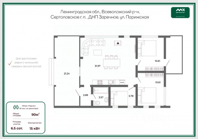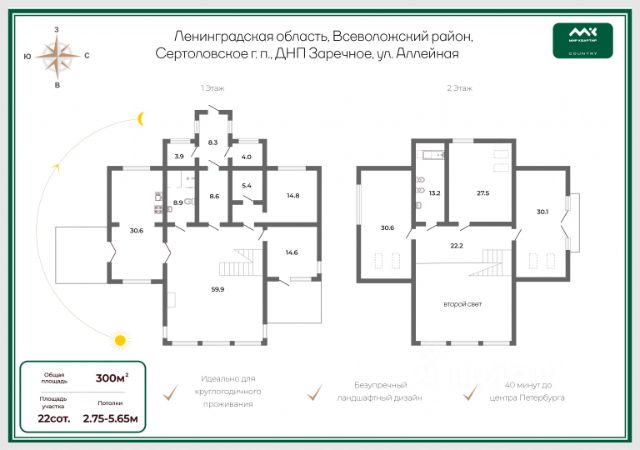 Арт. 123858267 В продаже дом из клееного бруса от компании "Good Wood" ("Гуд Вуд")! Дом 2023 года постройки, выполнен из клееного бруса 200х185 мм. Общая площадь 220 м2. Дом прекрасно подойдет в качестве загородного дома для постоянного проживания, поскольку расположен в хорошей локации с удобной транспортной доступностью - до города можно добраться всего за 30 минут! Функциональная планировка позволяет с комфортом проживает семье из 4-5 человек. Первый этаж имеет общую площадь 154 м2. Планировкой предусмотрено размещение следующих помещений: прихожая - 6 м2; помещение гардеробной - 6 м2; просторный с/у первого этажа - 8 м2; гостевая спальня с выходом на террасу - 15 м2; кухня-столовая - 20 м2; гостиная со вторым светом и камином - 31 м2; техническое помещение (котельная) - 7 м2; крытая просторная терраса - 22 м2. На втором этаже разместились 2 детские комнаты (15 + 15 м2) со своей ванной комнатой 6 м2, и большая хозяйская спальня (20 м2) со своей гардеробной (5 м2) и с/у (6 м2). Дом построен известной компанией "Good Wood" ("Гуд Вуд"), которая является одним из лидеров российского рынка малоэтажного строительства. Компания имеет свое производства и внимательно отслеживает стандарты качества при строительстве своих объектов. Конструктив дома: фундамент - монолитная железобетонная плита 250 мм; наружные стены - клееный брус сечением 200х185 мм; опорные столбы - из клееной древесины; перегородки первого и второго этажа - по деревянному каркасу с заполнением утеплителем; перекрытия - по деревянным лагам; кровля - скатная по деревянным несущим конструкциям. Покрытие кровли из мягкой черепицы. Утепление кровли 250 мм На границе участка расположены точки подключения к системе электроснабжения (15 кВт) и заведен магистральный газ (!) Участок огорожен с двух сторон забором - можно под своё видение определить место заезда на участок и размещение парковочной зоны. На земельном участке 11 соток растут высокие и красивые сосны. Подрастают молодые елочки. Участок имеет правильную прямоугольную фому. Прекрасная инсоляция позволит вам с комфортом наслаждаться солнечными лучами на протяжении всего года! Участок расположен в охраняемом посёлке. На въезде расположен магазин. Рядом с участком красивая зеленая лесополоса, которая великолепно подходит для пеших прогулок. Перед заездом в поселок есть хорошие озера для купания и времяпрепровождения с детьми (летом на пляже, зимой - на горке). Дом расположен всего в 30 минутах от города и имеет несколько подъездных маршрутов: по ЗСД и Выборгскому шоссе; через Сертолово; через Песочный; через Белоостров. Таким образом, у вас на выбор несколько удобных маршрутов! На съезде с Выборгского шоссе расположены пункты самовывоза и небольшие магазины. Данную локацию обслуживают многочисленные службы доставки. В Сертолово расположены школы и детские сады. В 10 минутах на а/м - торговый комплекс с МФЦ. Берег финского залива с многочисленными ресторанами и прекрасными видами в 20 минутах езды. Это идеальное, тихое место для постоянного проживания! По запросу вышлем видео и проект. Записывайтесь на просмотр дома из клееного бруса от компании "Good Wood" ("Гуд Вуд"), всего в 30 минутах от города