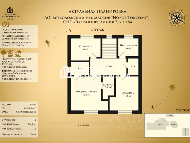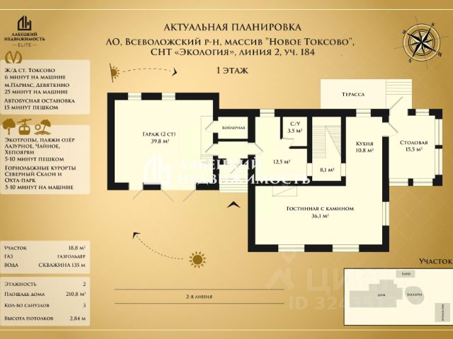 массив Ново-Токсово. (20 минут от города по асфальтированной трассе) Продаётся полностью готовый для круглогодичного проживания загородный Дом с гаражом и отдельно стоящей баней на участке 10 соток. *ОСНОВНОЙ ДОМ* 8*6м, 2 этажа, брус 200*200, отделка - сайдинг, кровля - металлочерепица. 1й этаж: летняя веранда, прихожая, уютная кухня-гостиная с камином. Санузел с душевой кабиной (откачиваемый септик на 5 человек +) 2й этаж: вместительная гардеробная и 3 спальни. Радиаторное отопление во всех помещениях. *ГОСТЕВОЙ ДОМ* 6*6м, 2 этажа, бревно 200мм, отделка - сайдинг, кровля - металлочерепица. 1й этаж: русская парная, комната отдыха. 2й этаж: гардеробная, просторная спальня с видом во двор. *ГАРАЖ с мастерской* 3*7м, кирпич/пенобетон, пол цемент-мозаичный, отделка - сайдинг, кровля - металлочерепица. Можно удобно парковать один большой автомобиль, либо хранить мотоциклы/квадроциклы/снегоходы... исключительно на Ваше усмотрение. *УЧАСТОК с мангальной зоной* Эксклюзивный ландшафтный дизайн, огорожен высоким кирпичным забором с откатными воротами на автоматике Въездная группа и подходы ко всем зданиям на территории выложены брусчасткой. Участок ровный, разноуровневый, сухой. Неприхотливый газон, ели, кедры, сосны, лиственница , слива очень вкусная. Прямая продажа. Один взрослый собственник. К сделке готовы. Просмотр в заранее оговоренное время. Звоните!