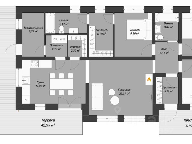 Первый этаж включает просторную кухню-гостиную (42 м²), гостевую комнату, санузел, технические и вспомогательные помещения.