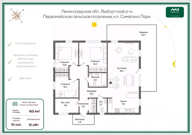 Предлагается к продаже готовый меблированный дом площадью 258,4 кв. м. На земельном участке с ландшафтным дизайном площадью 16 соток располагается крытый гараж с навесом и отдельно стоящая баня с террасой. На первом этаже, из холла с зоной хранения открывается вид на совмещенную гостиную с кухней и столовой, общей площадью 90 кв. м. Кухня укомплектована всей необходимой встроенной техникой и оборудована широкой барной столешницей. Из гостиной можно выйти на просторную террасу с зоной для отдыха и барбекю. Из панорамных деревянных окон открывается вид на участок с озеленением, альпийской горкой и искусственным водопадом. Участок скрыт от посторонних взглядов зелеными насаждениями и живой изгородью по периметру дома. На второй этаж ведет деревянная лестница со вторым светом, где расположены три спальни с балконами и элементами скандинавского дизайна. Улицы поселка асфальтированы, въезд на территорию оснащен видеонаблюдением и пунктом охраны. "Малое Симагино" - закрытый охраняемый коттеджный поселок со своими водоемами на территории, находящийся в непосредственной близости от Симагинского озера и эко-парка "Вереск". Находясь в окружении хвойных лесов Карельского перешейка, он также обладает исключительной транспортной, социальной и торгово-развлекательной инфраструктурой. В непосредственной близости находится парк отдыха для всей семьи "Озорные белки", совсем недавно была открыта частная школа "Траектория жизни". Всего в 10 минутах компания "Газпром" заканчивает строительство поистине грандиозного проекта - многофункционального спортивно-развлекательного комплекса с бассейнами, ресторанами и сквошем. В то же время транспортная доступность позволяет владельцам загородных домов добираться до центра Санкт-Петербурга за 45 минут.
