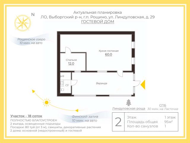 Арт. 109268270 Продается участок 18 соток с готовым гостевым домом 95м2 и основательным фундаментом под большой дом (Курортное направление СПб) Участок: - 18 соток правильной формы, ИЖС - Полностью благоустроен: отсыпан и выровнен, дренажная система (сделан качественный быстрый отвод воды) , с внешней стороны участка с двух сторон облагорожены канавы бетонными лотками и высажены елки - Капитальный забор: профнастил на ленточном фундаменте на бетонных сваях - 2 въезда (распашные и откатные ворота), освещенные подъезды - Посадки: 80 туй (от 3 м), самшиты, декоративные растения Дома: **Гостевой (95 м²):** - Готов для проживания: большая кухня-гостиная, спальня, санузел, душевая и веранда - Качественные окна (3-камерные стеклопакеты 70 мм) -Отопление электрическое, артезианская скважина, септик **Основной (недостроенный):** - Цокольный этаж 160 м² (монолитный, с гидроизоляцией) сухой и теплый, чистая высота 2.10м - Подведены коммуникации (вода, газ, канализация) - Гараж на 4 машины с отдельным въездом - Прочный фундамент (выдерживает до 900 тонн) Выполнены дорогостоящие работы: под плитой фундамента выложена гравийно-песчаная подушка, уложен Пеноплекс, поверх него 2 слоя гидроизоляции. Гидроизоляция заходит за стены. Подземная часть цокольного этажа выполнена из монолитных стен до уровня земли. Выше земли кладка из красного кирпича. **Коммуникации:** - Электричество: 30 кВт (счетчик день/ночь) - Вода: артезианская скважина + колодец - Канализация: септик - Газ: по границе участка **Инфраструктура:** - Магазины ("Пятерочка", "Магнит"), кафе, аптеки, поликлиника - Школы, детские сады, стадион, строящийся ледовый дворец , Пухтолова гора, Линдуловская роща - Озеро в центре поселка, залив в 10 мин на машине - До СПб: 30 мин на электричке ("Ласточка") станция недалеко от дома, 40-50 мин на авто Идеальный участок для творения дома вашей мечты, основа уже вся капитально заложена, осталось совсем немного до полноценной готовности. Хорошая транспортная доступность и развитая инфраструктура, поэтому можно жить круглогодично. Тот, кто разбирается в строительстве, обязательно оценит подход к стройке и, что количество вложенных денег в освоение участка использовано гораздо больше цены продажи) Поэтому звоните, все расскажу и покажу, мне точно есть еще, чем похвастаться!)