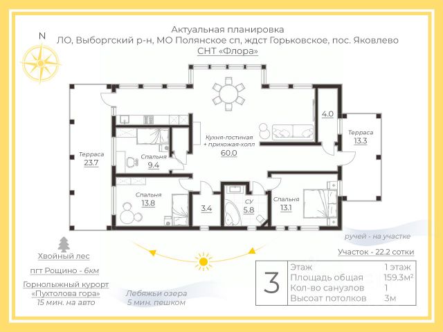 Продаётся новый одноэтажный дом площадью 115,5 кв. м для круглогодичного проживания на ухоженном участке 5,75 сот. в закрытом коттеджном посёлке Рощинский хутор-4 в окружении лесов и озер. Номер объекта: 100_220 В доме расположены просторная кухня-гостиная, 2 спальни, санузел с сауной и техническое помещение. Дом с двумя террасами, выходящими на разные стороны. Выполнен качественный ремонт и готов к проживанию. Конструктив и отделка: -Фундамент - железобетонные сваи. -Каркас - из сухой доски сорта АВ. -Утепление - перекрёстное, базальтовый утеплитель Rockwool Скандик 200 мм. -Обшивка - имитация бруса. -Кровля - металлочерепица GrandLine. -Окна - двухкамерные стеклопакеты. Все коммуникации заведены в дом, участок с заездом. Коммуникации: -Электричество - подключено 15 кВт, 380В, двухтарифный счетчик, прямой договор с Ленэнерго. -Водоснабжение - центральное внутрипоселковое. -Отопление - электрическое. -Канализация - септик. Магистральный газ планируется к подведению в 2026 году. Посёлок закрытого типа с въездом через шлагбаум, дороги - гравий. Посёлок практически полностью застроен, многие жители проживают круглогодично. На въезде в посёлок расположены магазины Магнит и Пятерочка. В 7 км, в пос. Рощино, есть вся необходимая инфраструктура: школы, детские сады, поликлиника, больница, аптеки, банки, рестораны и многое другое. В получасе езды - курортные посёлки Комарово, Репино, Солнечное с пляжами Финского залива. Рядом горнолыжный курорт Пухтолова гора. Удобная транспортная доступность: На автомобиле от КАД и ЗСД не более 40 минут От Ж/Д станции - 25 минут на автобусе. Возможна покупка в ипотеку (не подходит под льготные госпрограммы). Дом в собственности. Документы готовы к сделке. Звоните! Будем рады ответить на все имеющиеся вопросы и запланировать показ в удобное для Вас время!