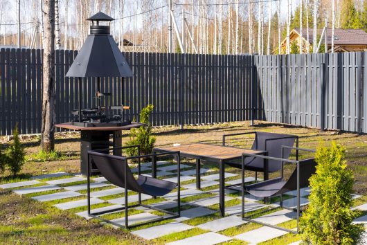 В стоимость включено обустройство забора на железобетонных сваях и деревянным штакетником, отъездными воротами и калиткой в единой стилистике с соседними участками.