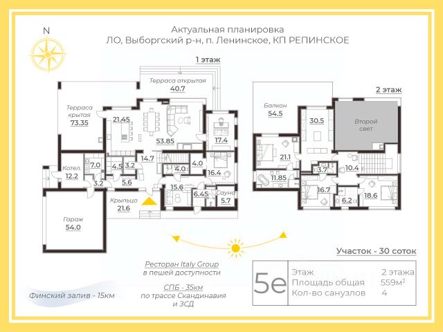 прихожую, гардеробную, кухню-гостиную со вторым светом (высота потолка 5,5 м!) - общей площадью почти 100 кв. м! Просторная гостиная позволит воплотить любые ваши самые смелые желания для комфортного проживания большой и дружной семьи! Кроме того, на 1 этаже расположены: гостевая комната 15 кв м, санузел, котельная, кладовая, постирочная и гараж с подъемными воротами (фирма Алютех).