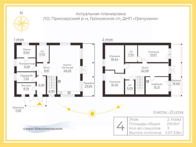 Предлагаем вашему вниманию домовладение на первой береговой линии Суходольского озера, в окружении соснового бора. Здесь царит атмосфера спокойствия и гармонии с природой, идеально для тех, кто ценит комфорт и уединенность. На участке площадью 42,5 сотки расположился основной дом 697 кв. м, гостевой дом 108 кв. м, гараж на три автомобиля, летняя баня с чаном для купания, зона барбекю. Здесь есть все для семейного отдыха и личного пространства. Дом выполнен из экологически чистых материалов: стены возведены из высококачественного клееного бруса, внутренние поверхности отделаны натуральным кедром и пропитаны пчелиным воском. Комнаты оборудованы теплыми водяными полами, покрытыми натуральной дубовой массивной доской и клинкерной плиткой, создающими уют и тепло в любое время года. Потолки высотой 6 метров и панорамные окна открывают захватывающий вид на природу, подчеркивают объем и создают ощущение свободы. Планировкой дома предусмотрены большие пространства помещений: зимний сад 83 кв. м, кухня-столовая и гостиная с камином, общей площадью 190 кв. м, Каждая спальня оснащена ванной комнатой с панорамными окнами. Участок оснащен современной дренажной системой, зеленым газоном и подготовлен для автоматического полива, мощение выполнено качественной клинкерной брусчаткой производства ЛСР. Ландшафтный дизайн и разнообразие плодовых и декоративных растений удовлетворит самых требовательных клиентов, а садовый фонтан наполнит воздух освежающей прохладой. Коммуникации: электричество составляет 30 кВт, обеспечено подключение газа, воды и канализации центрального типа, установлено оптоволокно. Внутреннее устройство дома оснащено системой климат-контроля. Расположение коттеджного посёлка "Суходольское" поистине уникально. Он находится на берегу самого большого из озёр Карельского перешейка озере Суходольское. На территории поселка, граничащей с природным заповедником, сохранен уникальный холмистый ландшафт с перепадом высот более чем в 16 метров, природный ручей, вековые корабельные сосны, небольшое внутреннее озеро с рыбой. Построены детская и спортивная площадки, теннисный корт, оборудованы прогулочная зона, благоустроенный песчаный пляж и охраняемый пирс для водного транспорта. Расстояние от Санкт-Петербурга до поселка по трассе — 98 км. Купить дом с газом в сельском поселении Громовское Приозерского района.