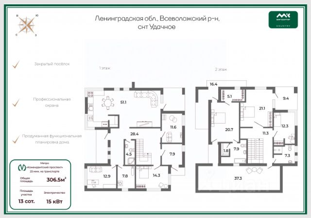 Арт. 133150472 Продается современный дом в центре коттеджного поселка "Чехофф" Ищете идеальное место для комфортного загородного проживания? Представляем вашему вниманию новый двухэтажный дом, расположенный в живописном районе Ленинградской области, Всеволожском районе, в массиве Белоостров. Этот уникальный объет расположен на участоке площадью 9 соток и предлагает все условия для настоящего уединения и комфорта. Дом отличается современной архитектурой с плоской крышей и панорамным остеклением от пола до потолка. Продается в теплом контуре, что позволяет вам с легкостью адаптировать его под свои потребности. Проектирование дома изначально предусматривало просторную гостиную с выходом на террасу, идеальную для семейных встреч и уютных вечеров. Кухня-столовая также имеет выход на вторую террасу внутреннего двора, что создает атмосферу уединения и комфорта. На первом этаже расположены гостевая спальня, кабинет, гардеробная и санузел. Второй этаж отведен под хозяйские спальни: здесь размещены четыре спальни, среди которых мастер-спальня с собственной ванной комнатой и гардеробной. Три спальни верхнего этажа имеют балконы, откуда открывается живописный вид на окрестности. Коттеджный поселок "Чехофф" это идеальное место для жизни. Он построен в едином архитектурном стиле, а охраняемая территория с пропускной системой обеспечивает безопасность и комфорт. Состояние инфраструктуры на высоком уровне: всего 36 км до Санкт-Петербурга и 15 минут до Финского залива. На территории поселка асфальтированные дорожки, детская площадка и доступ к лесу и озеру всего в 150 метрах. Не упустите возможность жить в этой идиллической обстановке запланируйте просмотр и откройте для себя новый уровень загородной жизни! Купить дом с газом в сельском поселении Юкковское Всеволожского района.