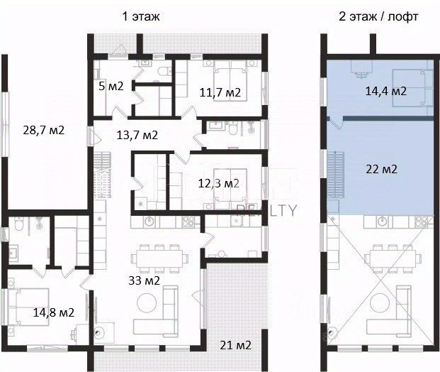 На 2 этаже расположена основная мастер-спальня (21 кв.м) с выходом на шикарную террасу, с просторной ванной и гардеробной, 2 детские спальни с общим санузлом, а также общественная зона - видовой холл.