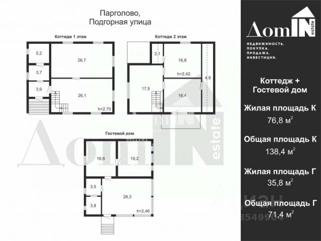 Арт. 133442985 В Санкт-Петербурге, в поселке Парголово, на ул. Подгорная продаётся коттедж+ гостевой дом + баня, общей площадью 260 кв.м, с участком 13.5 соток, ИЖС. Помещения распланированы так, что могут жить 3 семьи , отдельно друг от друга, с отдельными входами, не мешая друг другу. Коттедж 9,3х7,5 м, выполненный по индивидуальному проекту, с отличной планировкой, два жилых этажа площадью 140 кв.м. Городская прописка! Дом построен из бруса, обложен кирпичом, фундамент - ленточный. В доме удобная и функциональная планировка: 3 спальни, холл, просторная кухня, с/узел. К дому сделана пристройка с отдельным входом - 2 этажа - 50 кв.м. Кухня, 3 спальни, с/узел. Гостевой дом 8,40х8,36 м. Общая площадь 71,4 кв.м. Веранда, кухня-гостиная, 2 спальни, сан.узел с сауной. В домах: Отопление — газовые котельные в каждом доме, все официально оформлены. Водопровод - центральный, канализация - септик. Электричество — 12 кВт, интернет, телевидение. Коммунальные платежи включают в себя только электричество, воду и газ по счетчику, вывоз мусора. На участке правильной формы выполнен ландшафтный дизайн, на участке молодой фруктовый сад, много цветов. Достойное окружение. Городская прописка. Развитая инфраструктура. Отличная транспортная доступность 15 мин транспортом до Финского Залива, 15 мин. транспортом до метро пр. Просвещения, Удельная или Озерки, 20 минут транспортом до Финляндского вокзала. Подъезд круглый год без проблем, дороги чистят всегда(муниципалы)! Организован вывоз мусора. Общеобразовательная школа рядом. Поликлиника взрослая и детская, церковь, ДК, почта, магазины в шаговой доступности. Дом жилой, хозяева проживают круглый год. Просмотры в любое время. Документы готовы. Приобретая этот дом Вы живете в окружении природы, с городским комфортом. Встречная покупка подобрана. Направление: Юкки, Осиновая Роща, Левашово Дом на улице Подгорная в поселке Парголово в Санкт-Петербурге.