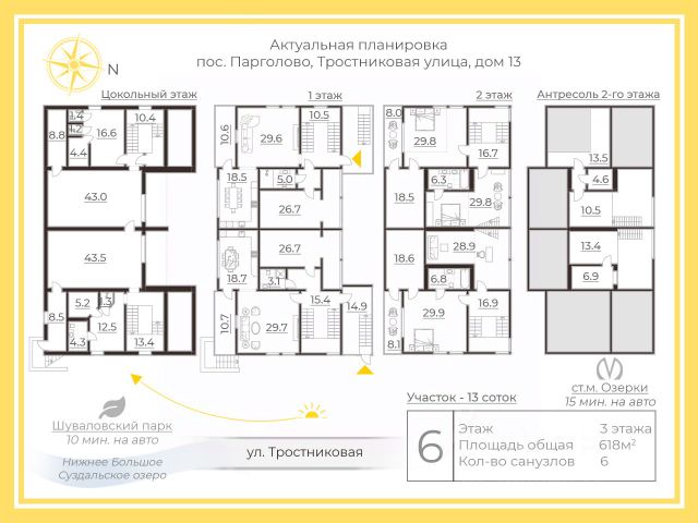 Арт. 69282265 Продаётся трёхэтажный дом, общей площадью 618 квадратных метров в 30 минутах от центра. Он необычен и функционален, благодаря зеркальной планировке, так как построен для двух семей. Дом расположен на ухоженном участке с высаженными деревьями, кустарниками и цветами. Всего здесь 6 комнат, 2 из которых мастер-спальни со своим санузлом и гардеробом. Также есть спальня с выходом на лоджию, а на верхних этажах расположены детские комнаты. В каждом крыле по санузлу с ванной и двумя умывальниками, кухня-столовая, кабинеты с удобными столами и стульями. Главное место отдыха — сауна с печкой на дровах. Их здесь тоже две. В доме выполнен ремонт, установлены панорамные окна, через которые вы можете любоваться природой. Есть места для парковки автомобилей и мангальные зоны со своей детской площадкой. В каждое крыло ведёт отдельный вход. Это идеальное место для отдыха с друзьями и их детьми, а также для жизни в пригороде, но при этом вблизи города. Чтобы осмотреть дом вживую, свяжитесь со мной по указанному номеру. Дом на улице Тростниковая в поселке Парголово в Санкт-Петербурге.