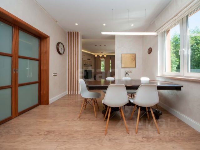 Предлагается к покупке трехэтажный дом 594,7 кв. м, с террасой 40 кв. м с панорамным остеклением, гаражом на три а/м и банным комплексом. Элегантный объект со стилистикой Ар-деко: много блеска, полутона природных красок, четкая геометрия каждого помещения. Баланс между металлом, деревом, камнем и стеклом. Место, где много света и воздуха. В доме 7 спален, 4 санузла, кабинет, гостиная-кухня-столовая, детские, кинотеатр, технические помещения и мансардная часть, куда выведены все инженерные узлы. Первый этаж единое пространство, в котором соединены гостиная с камином с отделкой из оникса, кухня и столовая с выходом на террасу. Кухня с итальянскими комплектующими и техникой Kuppersbusch. Зонирование делает особенно красивым сверкающие люстры и отделка камнем. Второй этаж это приватная зона. Пять спален. Большой холл с местами для хранения. Ванная комната с окном - 17,5 кв. м отделана мрамором и спроектирована так, чтобы всем было комфортно. Мастер-спальня с огромной кроватью от Fendi, брутальные лампы и мебель от Eichholtz. Стены спальни обшиты тактильно приятным текстилем. Мастер-гардеробная комната изыскана, функциональна и вместительна. Каждая из остальных спален индивидуальна. Они прекрасно подходят для разнополых детей различного возраста. Во всех спальнях дубовый паркет. Особое место в доме занимает кинозал на третьем этаже, где по проекту запланирован еще бильярд. Две гостевые спальни и санузел. Система кондиционирования и приточно-вытяжная вентиляция. Два водяных контура: первый отапливает дом, второй зону въезда. Отопление газовое. Банный комплекс из клееного бруса Honka с сауной, может рассматриваться, как гостевой дом. По внешнему периметру - система видеонаблюдения. В доме все коммуникации городские: электричество, газ, вода, канализация. На участке общей площадью 1200 кв. м сделан ландшафт и мощение. Купить дом в микрорайоне Петергоф в Санкт-Петербурге.