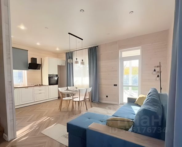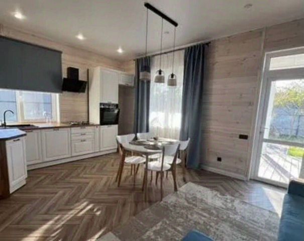 На первом этаже расположена светлая гостиная 36,6 кв.м., окна которой выходят в цветущий сад. Небольшая комната 10,6 кв.м. у входа в дом может служить гардеробом или быть кабинетом. Также на 1-м этаже находится кухня-столовая 14,2 кв.м., санузел 4,9 кв.м. и встроенный гараж 28,5 кв.м. с автоматическими воротами. Высота потолков - 3,15 м.