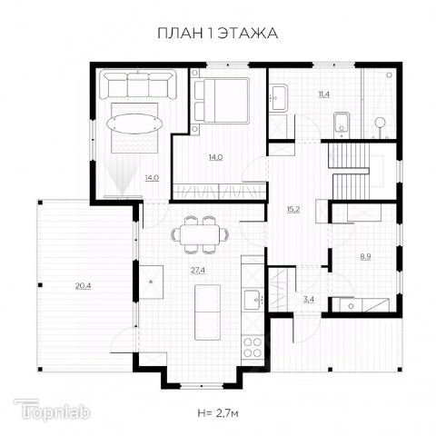 + В доме расположена кухня-гостиная 27,4 кв.м, укомплектованная мебелью и техникой, с дополнительным выходом на террасу;
