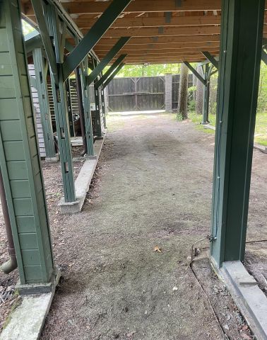 Территория огорожена, забор металлический, ворота откатные электрические. Над въездной зоной навес, парковка на 4-е автомобиля.