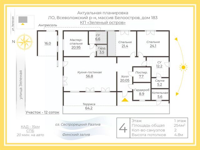Арт. 115176555 Предлагается к продаже великолепный дом в стиле Ф.Л. Райта в одном из самых современных и благоустроенных локаций Белоострова - КП "Зеленый остров". В доме выполнена предчистовая отделка с разводкой электрики и отопления. Общая площадь 297 м2 включает в себя четыре спальни и огромная кухня-гостиная две мастер спальни с собственной гардеробной и санузлом терраса отделанная натуральной лиственницей полное благоустройство участка с ландшафтным дизайном теплые водяные полы на первом этаже встроенный отапливаемый гараж и навес на две машины эффектная диодная подсветка фасада дома высажены декоративные растения и газон, установлен механизм откатных ворот. По технологии строительства: Дом из газобетонных блоков с утеплением Фундамент - бетонная плита 300 Стены - газобетон 400мм Кровля- мягкая черепица Перекрытие межэтажное - монолитное О поселке Дом расположен в закрытом элитном коттеджном поселке "Зеленый остров". Детская площадка с каучуковым покрытием, зимой - хоккейная коробка Электричество 15 кВт магистральный газ в процессе подключения подземный дренаж электрические фонари с LED освещением круглосуточная охрана До Лахта центра - полчаса на автомобиле. Курортный район, Солнечное, Сестрорецк - в пределах 10 минут, жд платформа Белоостров- 7 минут ходьбы. Лучшие школы Сестрорецка, фитнес-клуб Золотой ручей, Рыба на даче - 5 минут езды Дом и место - идеальное для постоянного проживания и загородного отдыха, будет отличным решением как для семьи с детьми, так и для взрослых родителей. Просмотр возможен в любое удобное время, дом свободен и ждет своих новых владельцев. Предлагаем ПРЕМИАЛЬНОЕ обслуживание для требовательных клиентов. Оперативно организуем просмотр, предоставим полную информацию по объекту. 20 лет работы с требовательными клиентами подготовили нас к решению ВАШИХ сложных задач. Будем рады знакомству! Ул. Рубинштейна, д.8. Отличный дом, участок 12 соток в городском поселении Сертоловское Всеволожского района.
