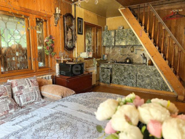 2 этаж — мансарда, снаружи покрыта биотексом, внутри обшита вагонкой и покрашена биотексом-Сосна, стены утеплены, потолок — нет, пол — доска, окрашен эмалью, 2 окна с деревянными рамами;