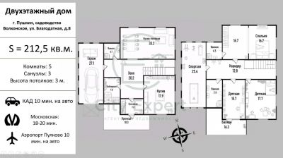 Нигде нет скошенных потолков! Общая плoщадь дома 212,5 кв.м.