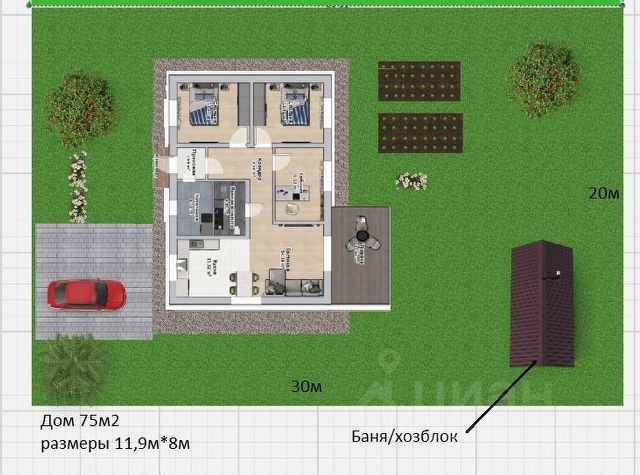 Есть парник, плодовые деревья и кусты.