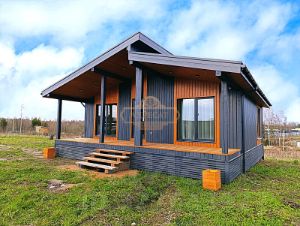 - одноэтажный дом 9*10 м каркасного типа, с двумя спальнями, кухней - гостиной, санузлом и котельной (кладовой). Планировку вы видите на фото;