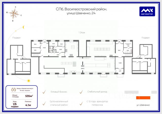Арт. 130033141 Продаётся торговое помещение с сетевым арендатором ПЯТЕРОЧКА. Отличное месторасположение - густо населённый спальник. Помещение находится в 5-ти этажном доме, в окружении многочисленных домов, учебных заведений. • 4 минуты до остановки общественного транспорта; • 10 минут до метро на транспорте Основные характеристики: • Общая площадь: 535 м2; первый этаж, плюс часть подвала, высота потолков 1 этаж - 4.1 м, подвал - 2,5 м • Мощность электросети: 39 кВт; •Согласована зона разгрузки; Стоимость, условия сделки: 80 000 000 руб.; • Арендатор "Пятерочка" с 2012 года, договор аренды продлен до 2031 года; • Месячный арендный поток - 580 000 руб/мес. Стабильно; Односторонняя индексация - 5 процентов. Описание: Высокий пешеходный и автомобильный трафик; 7 Витринных окон; 4 отдельных входа; Помещение в хорошем состоянии; Все коммуникации: телефонные линии, водоснабжение, канализация, теплоснабжение, есть системы вентиляции и кондиционирования, электроснабжение 39 кВт, пожарная сигнализация; Юр. статус владельца - собственность. Подойдет под любой вид деятельности; Звоните , организуем просмотр в удобное для вас время. Предлагаем ПРЕМИАЛЬНОЕ обслуживание для требовательных клиентов. Оперативно организуем просмотр, предоставим полную информацию по объекту. 20 лет работы с требовательными клиентами подготовили нас к решению ВАШИХ сложных задач. Будем рады знакомству! Ул. Рубинштейна, д.8.