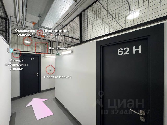 Отличная по всем характеристикам теплая и светлая кладовая, правильной формы, комфортного размера, которого хватит для всех сезонных вещей семьи из 2-3 комнатной квартиры. 2 капитальные стены для силового монтажа полок/стеллажей. Отсутствие коммуникаций над и вблизи кладовой. Дренажный приямок рядом. Непосредственно перед входом в кладовую размещена камера видеонаблюдения, прямо у кладовой — розетка. Постоянное яркое освещение, чистовая отделка (не требуется ровнять пол или стены). Прямая и короткая дистанция до лифта. Размеры 2.7м х 1.7м, дверной пролет 0.8м, высота около 3 метров. Вся высота доступна для монтажа и размещения вещей.