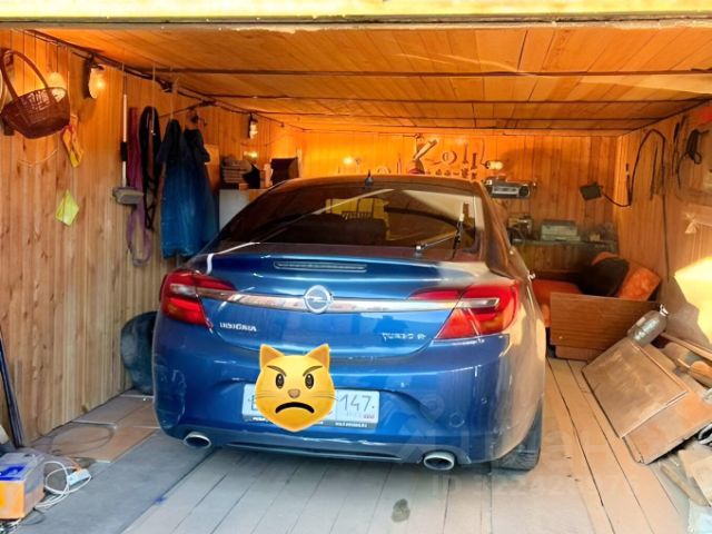 Железный, обшитый досками и ДВП. Сухой. Только что починили ворота. Открываются, даже без звука, не то что без сопротивления, навесной замок. Пол из досок прочный, даже не скрипит. Освещение от 36 вольт, лампочка на стене внутри, а электричество из розетки от столба в 10 метрах. Вдоль стены установлен шкаф с полочками.