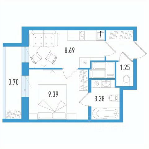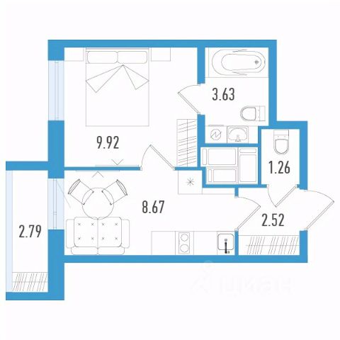Общая площадь — 27,6 м2, жилая — 16,2 м2