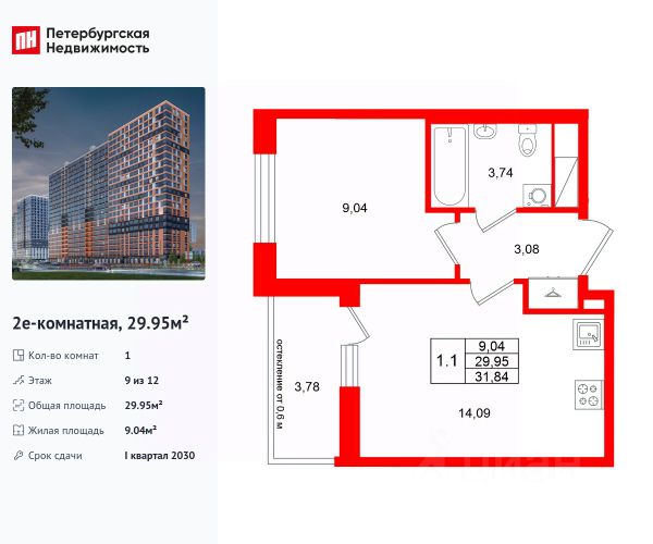 Продается уютная 1-комнатная квартира от застройщика в жилом комплексе "Город звезд" в новом городе на правом берегу Невы. До метро можно добраться на транспорте всего за 13 минут. Удобная, классическая, функциональная европланировка, большая кухня-гостиная 14.04 м², вместительная прихожая 3.05 м². Общая площадь квартиры - 29.4 м², жилая 8.44 м², высота потолка 2.77 м. Квартира продается с отделкой "Норд Лайн светлый". Что особенного в ЖК "Город звезд"? • Инновационный Лицей Setl с оригинальной архитектурной концепцией и уникальной образовательной средой • Невский лесопарк под окнами - всегда свежий воздух и полноценный отдых на природе • Четыре тематические площади отдыха с разнообразным благоустройством • Аллея Звёзд - променад протяженностью 5 км с ландшафтным озеленением, зонами отдыха и велодорожкой • Выход на набережную реки Утки, где можно порыбачить или взять напрокат лодку • Единая входная группа с ресепшен и подземный паркинг